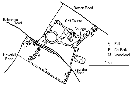 Head for the secure dog-walking track parallel to the Haverhill Road at the eastern end of the Car Park; follow round and up the hill now parallel to the Babraham Road.