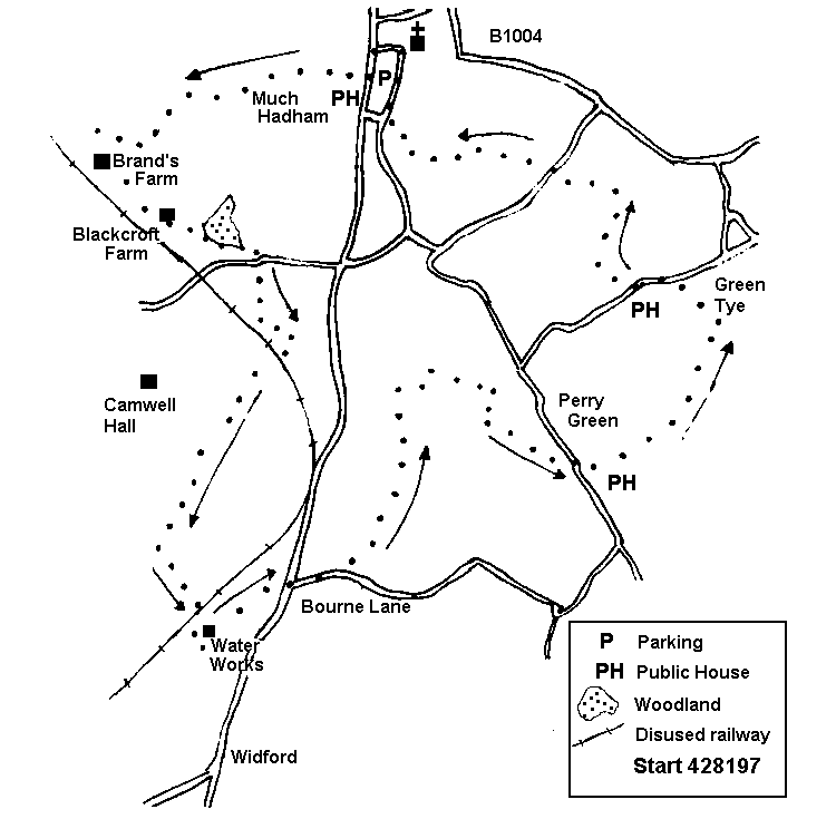 Good paths; interesting views; lovely houses and farms . Pubs in MH, Perry Green and Green Tye About 8 miles.